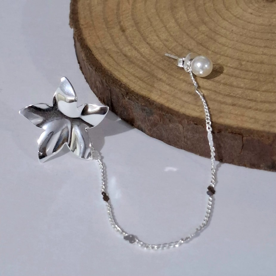 Brinco Pétala com Corrente e Mini Brinco com Zircônia - Folheado a Prata